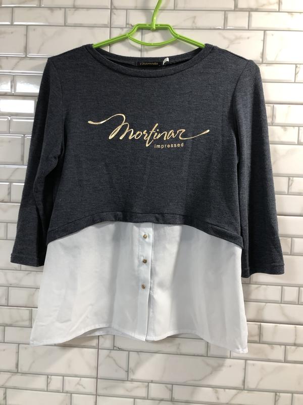 Джемпер з імітацією блузи Розмір вказано л Верх трикотаж , тянеться Низ як шифон) Бірки з складом немає Довжина 38/61 Рукав 45 Плечі 41 Пог 48/60 Понизу 53+