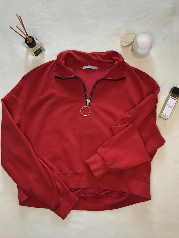 Червона укорочена кофта, з застібкою та кільцем, ззаду трохи подовжена