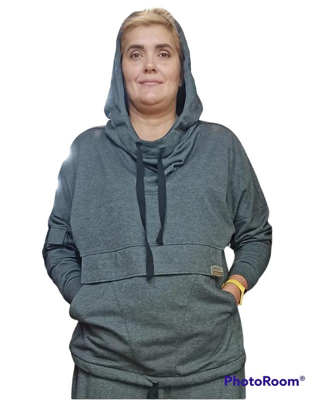 арт 630 стильна толстовка, худі, виконана з щільного турецького трикотажу петля!! cotton! великий капюшон скафандр,велика кишеня кенгуру під декоративним клапаном, на рукова теж є невеликий кишеню! каптур і низ затягується на хб кулісці! рукав спущений.один розмір оверсайз 48-50 ог 126 стегно 126 шр 46 довжина виробу 75, довжина рукова від шиї 72 на фото графіт