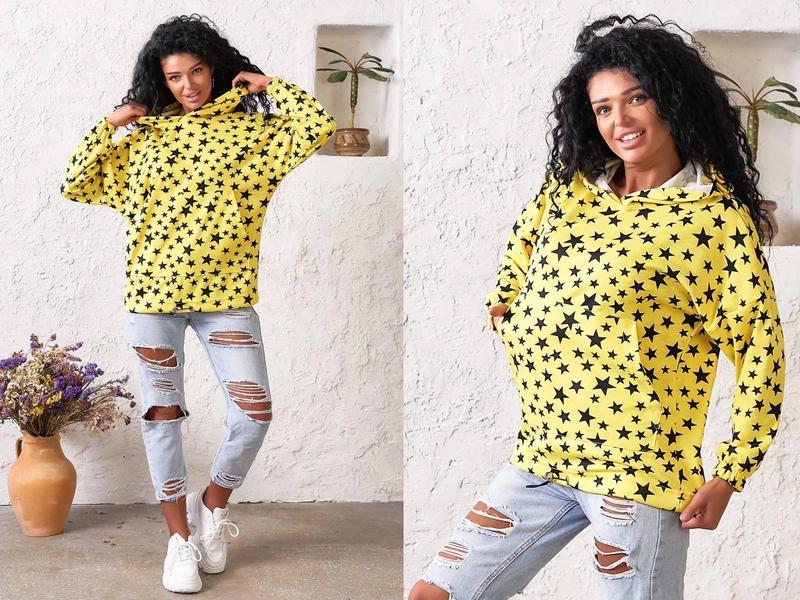 SD. Модель 779 - ХУДИ С КАПЮШОНОМ Цена : 300 грн. Размеры по бирке : 2(46-48);3(50-52)- чёрный 1(42-44);2(46-48)- белый 1(42-44)- жёлтый Ткань: французский трикотаж Яркая кофточка - худи с капюшоном «два в одном « ,свободного кроя ,с карманом ( кенгуру), со спущенным рукавом и манжетами на резинке. По низу худи имеется затяжка на стопорах , при помощи которой из удлинённого худи можно отрегулировать на укороченный вариант худи. Параметры: Размер по бирке 1 (42-44) Длина кофточки: 66 см Объём груди : 115 см Длина рукава по внутреннему шву: 40 см Размер по бирке 2 (46-48) Длина кофточки: 70 см Объём груди : 126 см Длина рукава по внутреннему шву: 40 см Размер по бирке 3 (50-52) Длина кофточки: 70 см Объём груди : 132 см Длина рукава по внутреннему шву: 40 см