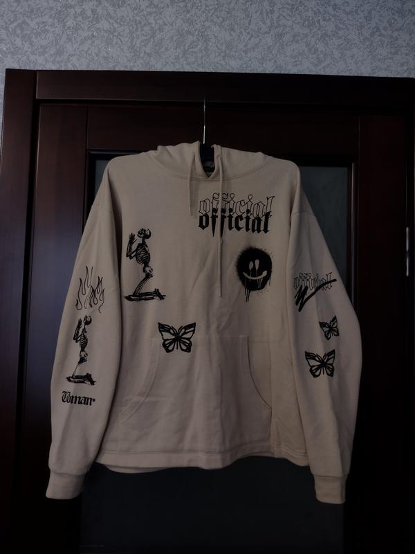 Дуже круте худі з принтом *є невеличкий дефект, в носці не помітний* Заміри: плечі-54, ширина- 56, довжина- 63; носила пару разів, але досить в гарному стані. Розмір S, але дуже великий, тому підходить і на L.Уточнюйте усі питання, що цікавлять моменти відразу,до оформлення замовлення! Торгу немає! Фото на тілі немає! Обміну та повернення немає!