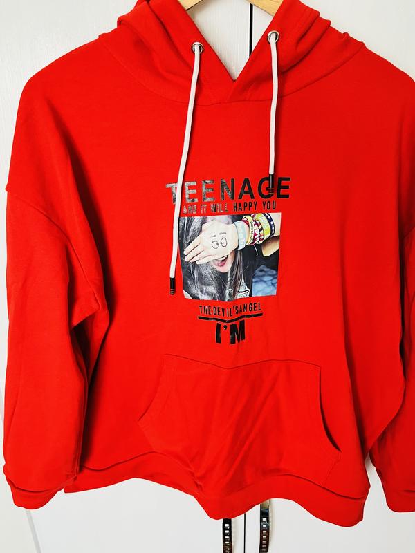 Худи красного цвета с принтом. Размер по набору XXL, но подойдет на XL. Не на флісі