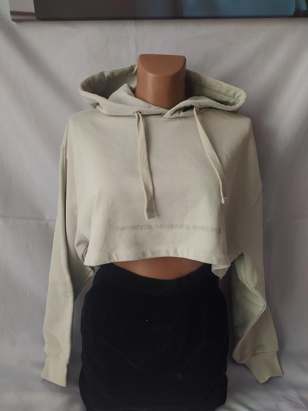 Укороченный худи с капюшоном. Новый (сток), но имеет дефект в виде зашитого пореза на рукаве сзади. На останньому фото. Материал: хлопок. Размер S. Замеры: ширина 55см, длина 34см, рукав от горловины 70см.