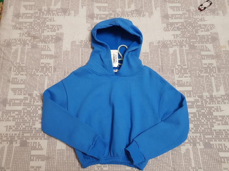 новое укороченное голубое худи. утепленное. на последнем фото две пятнышки, пришло с пятнами, отстирать не смогла. цвет, как на 3-4 фото