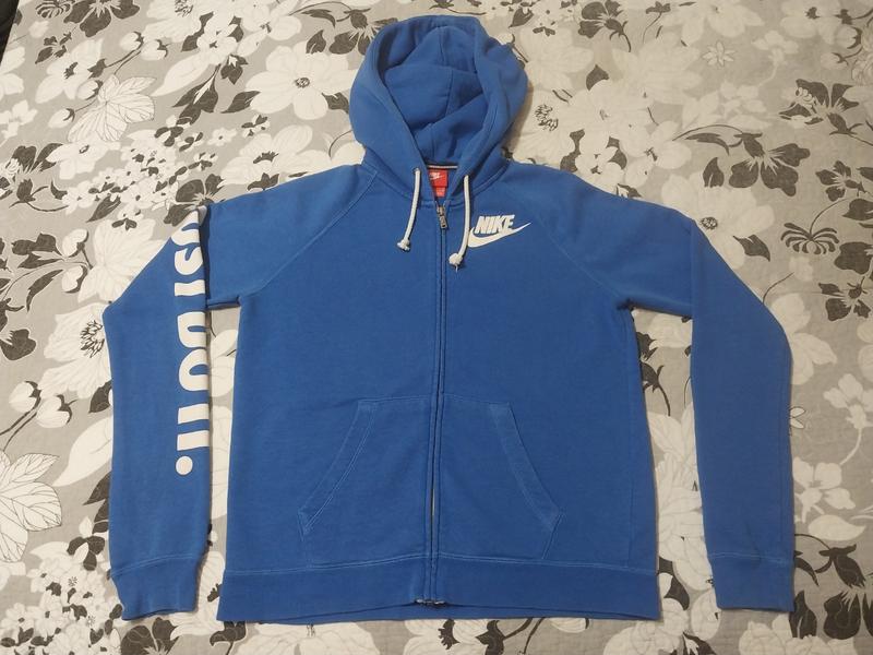 Женское зип худи Nike. Состояние очень хорошее. Минимальная потеря цвета по швам, после глажки. Цвет - голубой. Прорезиненные название бренда и лого на груди, а также прорезиненная надпись на весь правый рукав. Фурнитура YKK. Размер по наборке М. Замеры: плечевые швы отсутствуют, грудь 52 см, рукав от горловины 80 см, длина по спине 61 см.
