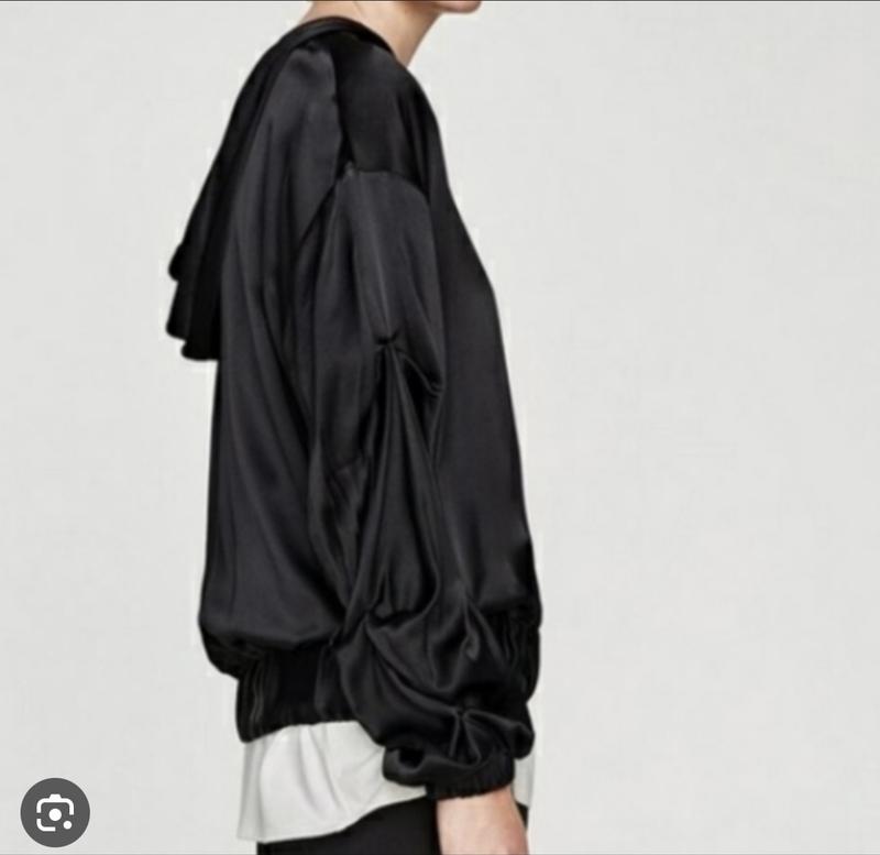 Стильне сатинове худі з натурального складу 100% віскоза. Тканина гарно спадає, плотна і важка. На рукавах гарні защепи, рукав обʼємний. Стан нового.