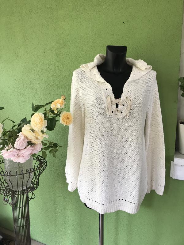 Стильная кофточка с капюшоном от amassing Dutti. Цвет сливочный. Состав:хлопок-100/. Размер по бирке-L. Замеры: длина-67 см, ПОГ-49 см, ПОБ-49 см, рукав-60 см. Тесьма «родная» отсутствует-я вставила свою для образца-можно заменить на любой цвет и размер-дырочки позволяют .