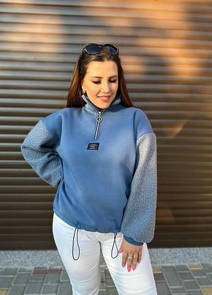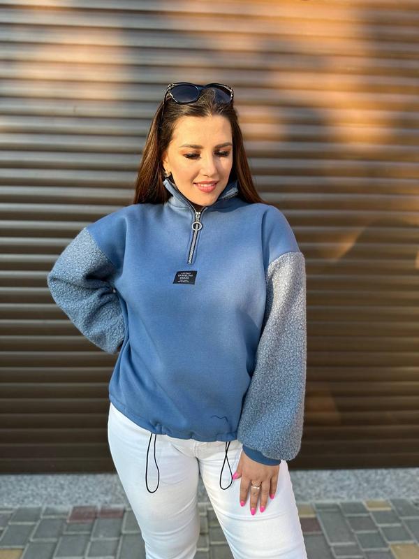 ▫️Размеры: 42-44;46-48;50-52;54-56 ▫️Цвета: черный, джинс, светлый беж, капучино ▫️Ткань: основа-турецкая трехнитка с начесом, очень хорошего качества(не скатывается, не линяет); рукава -дорогая ткань «барашок», мягкая и приятная, на ощупь; манжеты - турецкая рибана в цвет. ▫️Худи выполнено из дорогой ткани + качественный пошив; на горловине молния, спереди нашивка, на рукавах качественная рибана, по низу фиксируется шляпной резинкой с фиксаторами (можно регулировать объем талии). ▫️Параметры модели-нормы: ОГ 97, ОТ 70, ОБ 96, рост 170 см, на ней представлен 42-44 Параметры модели-батал: ОГ 108, ОТ 85, ОБ 108, рост 165. На ней представлен 50-52 ▫️Параметры по внешнему шву: 42-44: ОГ 120, ОТ 100, рукав от шва 51см, длина по спинке 54, высота воротника 8, длина молнии 24. 46-48: ОГ 126, ОТ 108, рукав от шва 51, длина по спинке 57, высота воротника 8, бицепс 52. 50-52: ОГ 132, ОТ 116, рукав от шва 51см длина по спинке 61, высота воротника 8, длина молнии 24 54-56: ОГ 140, ОТ 120, рукав от шва 51см, длина по спинке 62, высота воротника 8, бицепс 54.