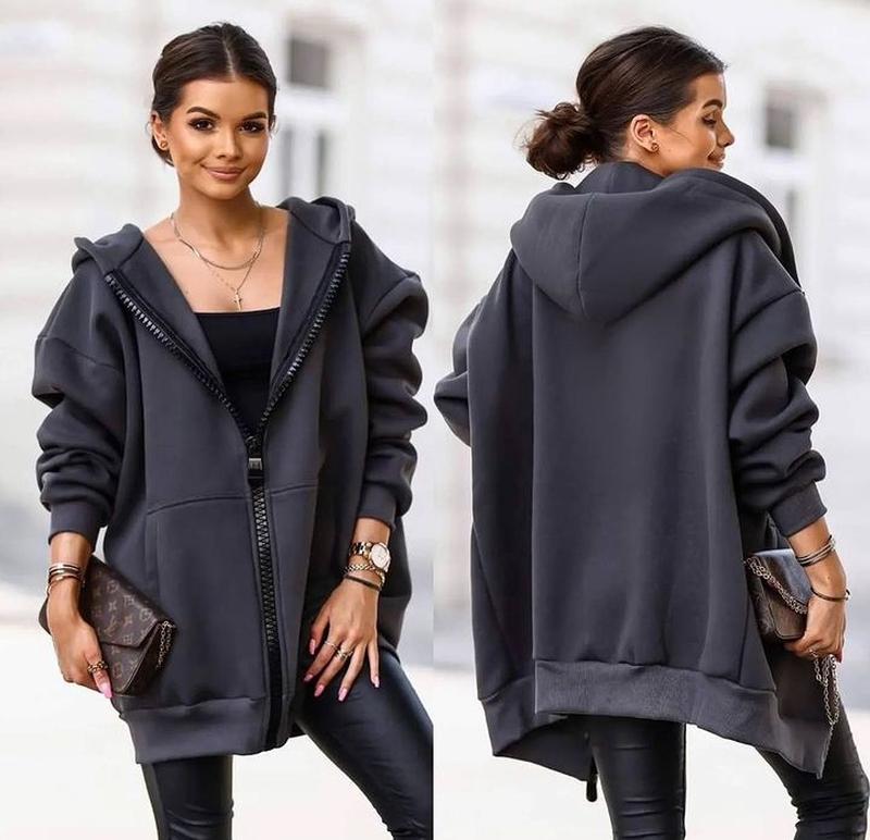 Удлиненное худи на молнии с капюшоном... мод. 834 Ткань: трехнитка на флис Размер: 42-46, 48-52 Цвет: черный, графит, бутылка
