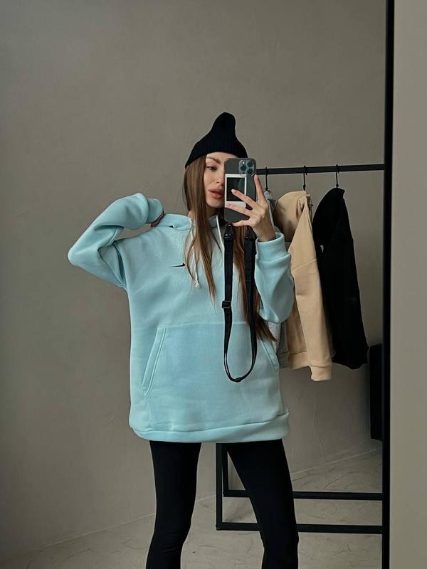 Розмір 42-46 оверсайз Тканина:турецька трьохнитка на флісі Рукав приспущений,глибокий капюшон,манжети із основної тканини,карман кінгуру. Заміри довжина 70см ОГ 112см Рукав від ворота 73см