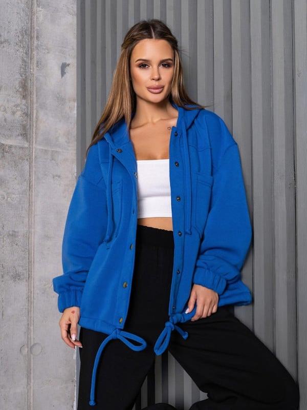 13554_электрик Утепленное ярко-синее худи на кулиске, выполненное из трикотажа на флисе. Модель на кнопках с защитным клапаном и карманами. Толстовка с прямым свободным кроем, капюшоном и длинными рукавами.
