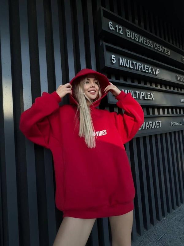 Худи оверсайз, который ты искала 😍 ▪️Размер 42-46 ▪️Тканина - трьохнитка на флісі ▪️Цвет - красный, синий Объемные худи в трендовых цветах ✔️ худи заряжены на «good vibes” 💓