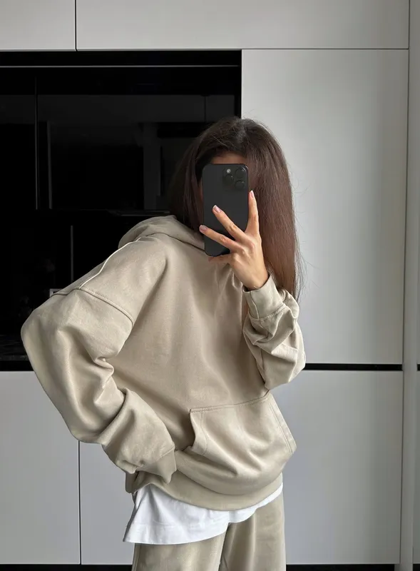 Худи бежевого цвета с капюшоном и длинными рукавами свободного кроя. Спереди есть карман. По низу изделия и на манжетах эластичная резинка. Материал - плотный футер трехнитка, в составе которого 100% хлопок. Подойдет на зиму для тех, кто не любит флисовое утепление. Собственное производство.