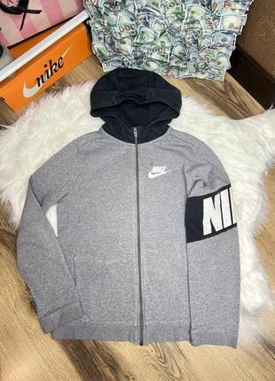Женская спортивная зипка от Nike в сером цвете,лого на руке с капюшоном )Размер по бирке подростковый Xl, подойдет на женской S-M, состояние отличное )