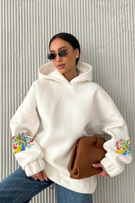 Худи Калина Ткань: Турецкая трехнить на флисе качества "пенье" Состав: 80% хлопок, 20% полиэстер Плотность 320 gsm Цвет: белый Размер: S-M, L-XL Параметры модели на фото Зріст: 170 см, ОГ: 86 см, ОТ: 64 см, ОС: 93 см. На фото представлена модель размер S-М (42/44). Комплектация: худи Фактические замеры изделия Объем по груди: S-M – 132; L-XL - 138; Объем по талии: S-M – 118; L-XL – 124; Объем по бедрам: S-M – 110; L-XL – 116; Объем рукава вверх: S-M – 44; L-XL – 46; Длина изделия по спинке: S-M – 75; L-XL – 75; Длина рукава от шеи: S-M – 86; L-XL – 86