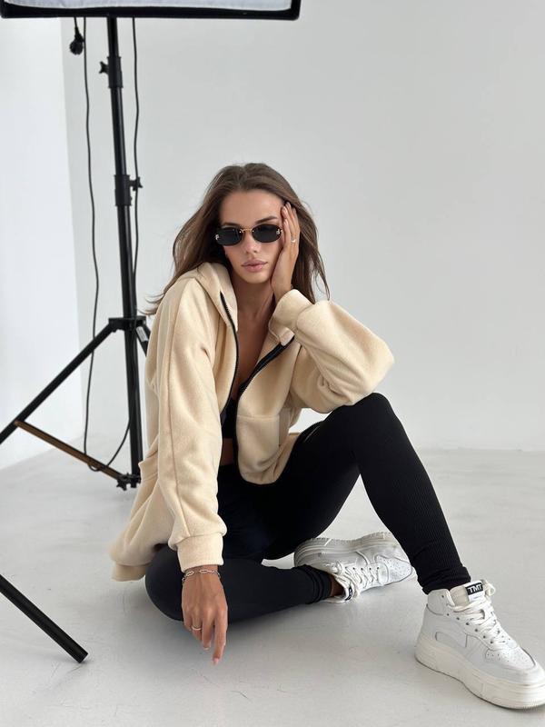 Кофта на молнии, фото реал ⠀ ▫️Размеры: универсал 42-46 ▫️Цвета: беж, серый, графит ▫️Ткань: турецкий полор флис (плотность 280) ⠀ Флисовый оверсайз батник с капюшоном, очень мягкий и приятный к телу. ⠀ Замеры: ОГ до 116 см ОС 106 см Длина 67 см Рукав от плеча 68 см ⠀ Модель 405