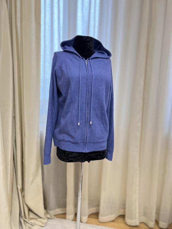 Тепленькая худи, очень мягечка и приятная к телу, с капюшоном, спереди по всей длине на молнии. Накладные карманы спереди. В составе 50% вискоза. Размер указан с, идет на с/м. Замеры: длина 57, рукав идет регланом длина от горловины 71, пог 52. Приятный цвет и отличное качество
