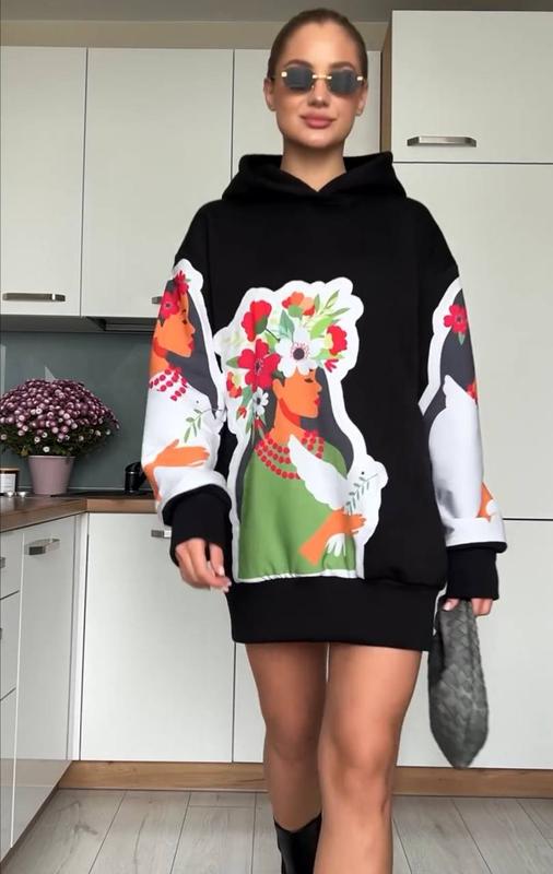 л лук ✔️Family Look 🔥Худи в черном цвете с ярким украинским принтом имеет идеальную длину, так что Вы можете носить его даже как платье, он также имеет спущенные рукава и капюшон🥰 ■ Арт.7709 ▪️Ткань: трехнить пенье на флисе высокого качества 90% бавовна. ▪️Размеры: ☑️ 140-152 ☑️158-164 ☑️44-48 ▪️Цвета:черный ✔️Высокое качество ткани и пошива.