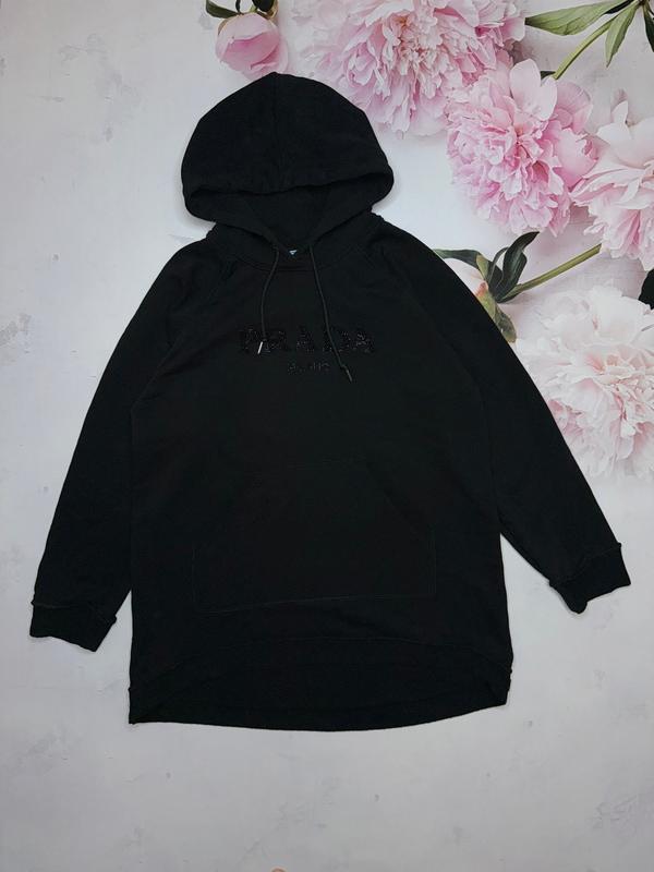 Чорне худі/сукня від Prada — елегантне втілення стилю й комфорту. Простий і вишуканий дизайн робить його універсальним вибором для повсякденного образу. Носіть цей чорний худі, щоб висловити свою любов до мінімалізму та високої якості у світі моди. Тканина петля Див. заміри Довжина 70/82. Пог 58. Рукав від шиї 70