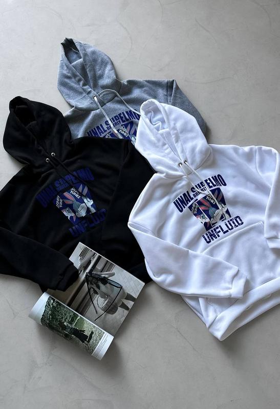 ХІТ🔥 ФОТО РЕАЛ🔝 🔸Худи «Bugs Bunny» ▪️Модель: 1376.23 ▪️Ткань: турецкая трехнить на флисе ▪️Размер: 42-48 (oversize) ▪️Цвет: белый, черный, меланж 🏷Цена: 580 грн🔥 Супер качество по низкой цене🔥 💬 Трендовый, яркий худи оверсайз с кроленком Bugs Bunny для стильных и юморных🔥 Глубокий капюшон, манжеты с основной ломтей, карман кингуру, шнурок. Качественная яркая накатка✅ ЗАМІРИ ВИРОБУ: 42/48 Длина 65 см ОГ 120 см Рукав от ворота 73 см