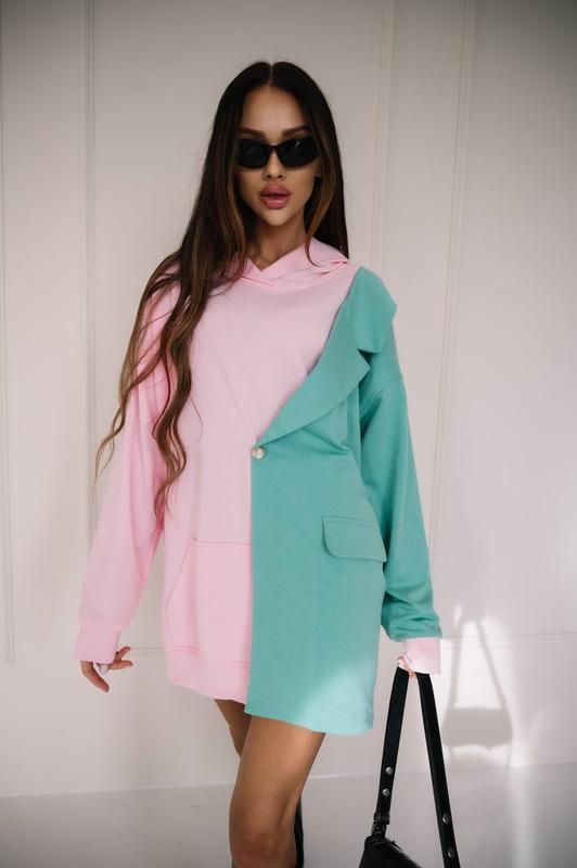 Худи, для самых стильовых 🤟🤟🤟 Модель : 326 Тканина : двонитка Размер : универсальный (42-48) Цвет: розово - бирюзовый 🌈 Замеры Длина по центру спинки - 75 см Плече(спущене) - 25 см Рукав (спущений) - 55 см Отделка,декоративная пуговица Рост модели на фото 173 см🥰 Ог -84 см🔝 От -63 см🔝 Ос -89 см🔝 Размер на моделе 42-44