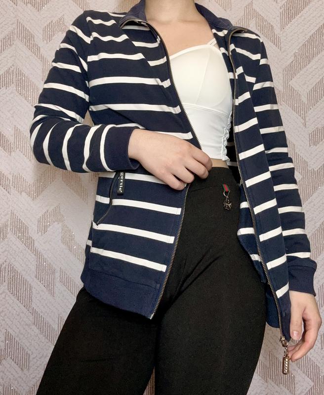 Кофта женская на застежке В хорошем состоянии Размер указан L, но на деле подходит на S-M (худника девушка, девушка средней телестройки) Цвет: темно синий, белый Принт: полоска горизонтальна