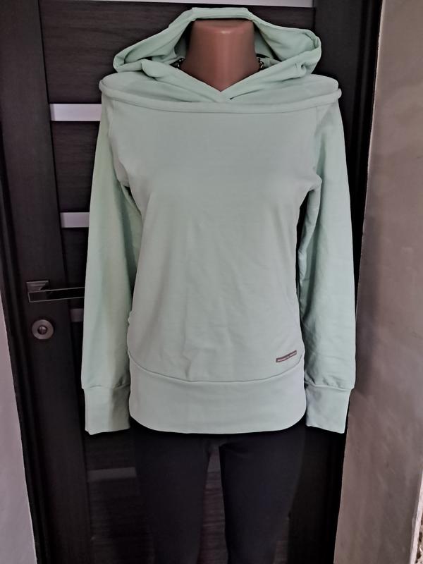 Фірмове жіноче худі, гарного м'ятного кольору, камера не передала колір, в житті виглядає гарніше, тканина приємна на дотик, капюшон та область плечей сіточка, розмір вказано S, але підходить і на М. п/об., грудей 45см., рукав 63 см., довжина 60см., низ п/об. 43см.
