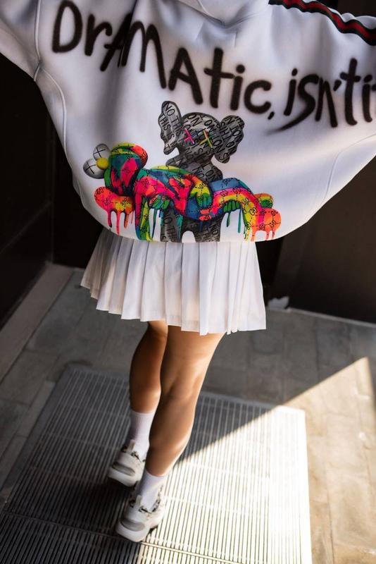 🥀Новинка🥀 Худи Код rz 185 Ткань: трехнитка на флисе + сублимация + РИБАНА Размер: 42-46 оверсайз Цвета: белый Объемный оверсайз худи с модным рисунком, который обязательно привлечет внимание. Приятная теплая ткань. Все детали пошива, как на фото. Робана на манжетах рукавов и снизу в поясе. Напис “Dramatic isn't it?” - “Драматично, не так ли?”
