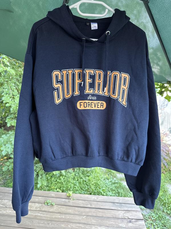 Худі вкорочений без карманів з капюшоном темно синього кольору з написом. Гарний стан, манжети і утеплювач в ідеалі. Довжина по спинці від горловини 52 см Довжина рукава від шва 58 см, рукав спущений Напів обхват по макс точці (приблизно в грудях) 64 см