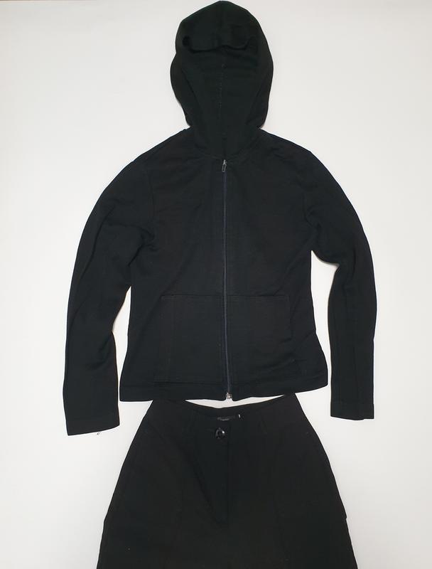 Худи на замке с капюшоном и двумя карманами черного цвета, не утепленное, из тонкого матера, садится достаточно свободно, но не оверсайз. Эффект : на одном из рукавов поторочилась ниточка