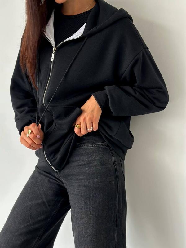 - Ткань: изготовлена из двухнитки с петлей и трикотажной подкладкой. Это обеспечивает легкость, мягкость и комфорт при носке. Ткань хорошо сохраняет форму и обеспечивает циркуляцию воздуха, что делает худи удобной для ношения в течение дня. - Цвет: 1. Черный- классический, универсальный и всегда актуальный. 2. Белый – свежий и чистый оттенок, который добавляет легкости образу. 3. Бордо – насыщенный и стильный цвет, что добавляет выразительности. - Размер: подходит для размеров 42-46, что делает худи универсальной и комфортной для разных типов фигур. Это зип худи сочетает в себе стиль, удобство и качественные материалы, идеально подходит для повседневной носки.