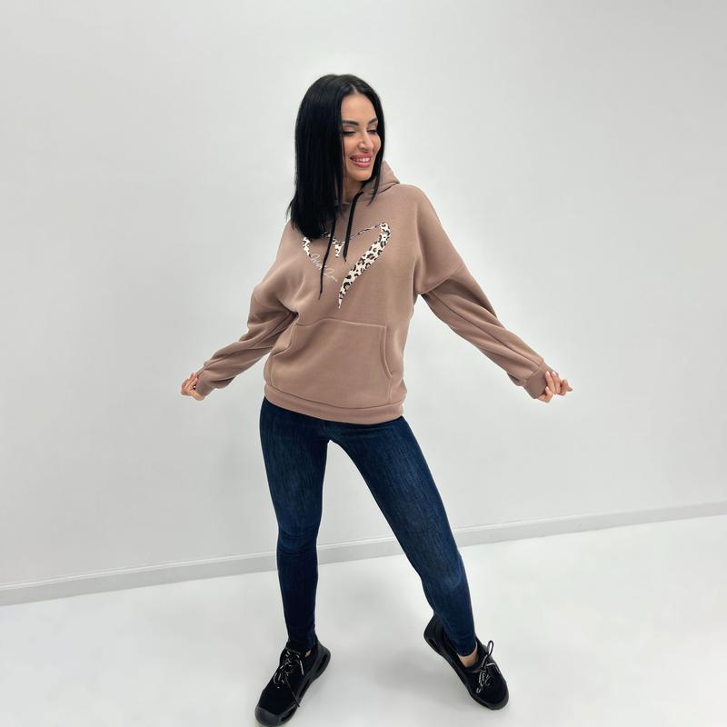 Женский батник с капюшоном "Amour" Арт.: 4187 ✔️привлекает внимание оригинальным рисунком в виде сердца с леопардовым принтом ✔️имеет свободный крой, не стесняющий движений ✔️изготовлен из утепленного флисом трикотажа Цена 🏷: 655 UAH 🌈Цвет: черный, бежевый, капучино, темно-зеленый, электрик, шоколадный, серый (меланж), графит ✂️Размер: 42-44, 46-48, 50-52 🧵Материал: трехнитка на флисе 📐Замеры: Длина по спинке: 64-67 см Длина рукава от горловины: 67-70 см