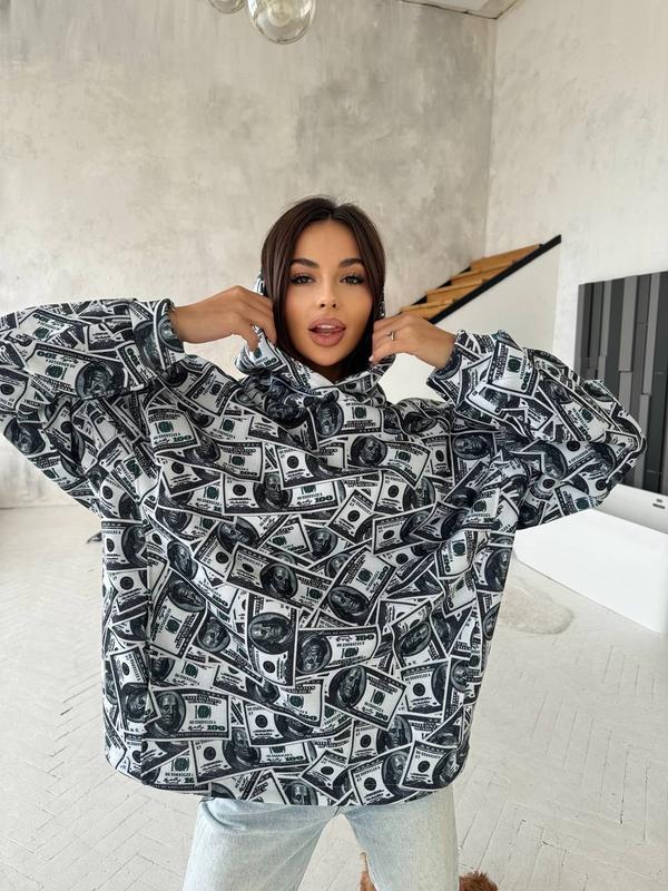 Худи🥰 Мод: 737-202 Размер: 42-48 Цвет: принт долларов Ткань: трехнитка на флисе Это худи с принтом “доллар” - стильный выбор для тех, кто хочет выделиться! Теплая трехнитка на флисе обеспечит комфорт и тепло, идеально подходит для прохладной погоды.