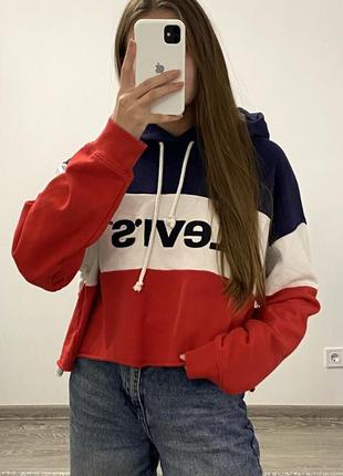 Стан - 5/5 Размер - L Замеры: Длина 48 Подмышки 63 Рукав от шеи 81 Стан супер. Принт нашит, целый. Кольори насичені. Трешки укороченный. Сзади есть едва заметное пятно, которое одиночку можно вывести. Также спереди есть нюанс, которого не видно, так как ткань закручивается (все есть на фото). Имеет большой и глубокий капюшон.