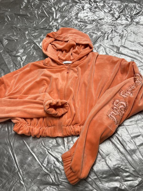 Велюрова, мʼяка , яскрава кофта Размер С-М длина 40 см На застежке На рукаве вышивка