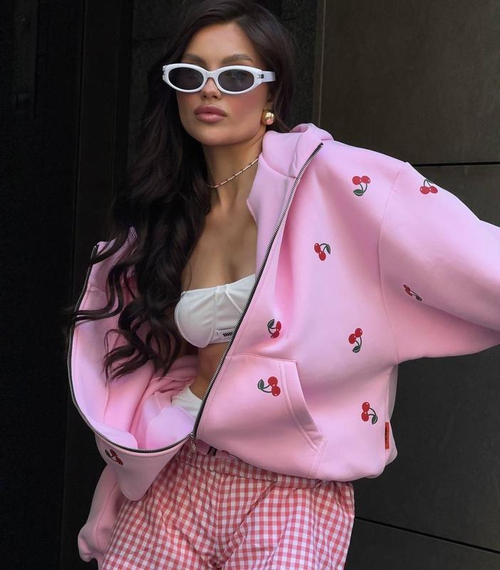 🍒ХУДІ ZIP CHERRY🍒 ▫️Мод: tr 0680 ▫️Размеры: 42-48 (oversize) ▫️Ткань: Трехнитка на флисе ▫️Цвета: Белый,Розовый ▫️код13 Идет свободного фасона в стиле оверсайз✔️ С двойным капюшоном✔️