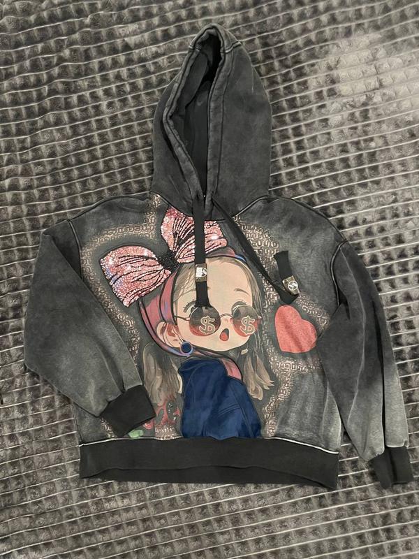 Худи оверсайз с капюшоном в стиле streetwear, выполненное в темно-сером, "изнаночном" оттенке. Изюминкой модели является яркий принт с изображением аниме-девочки в очках с символами долларов, большим бантом и сердечком, что добавляет игривости и оригинальности дизайну. Материал: плотный хлопок или его смесь, приятная на ощупь. Объемный капюшон с завязками; Резинки на манжетах и по низу изделия; Яркий и модный акцент на груди. Худи сочетает комфорт и стиль, подойдет для повседневной носки в холодную время года.