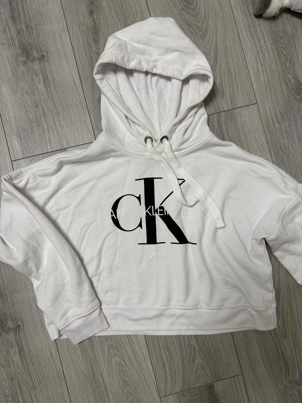 Укороченное худи Calvin Klein красиво сидит на теле, есть незначительные пятнышки (на последних фото)