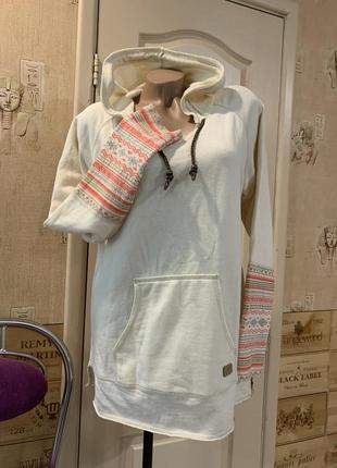 Худи толстовка отличного качества, красивый крой цвет светлый беж, с капюшоном с карманом кенгуру красивый принт на рукавах, состав ткани смешанный, в груди 53 рукав реглан от воро 70 длина изделия 72, нюанс на фото