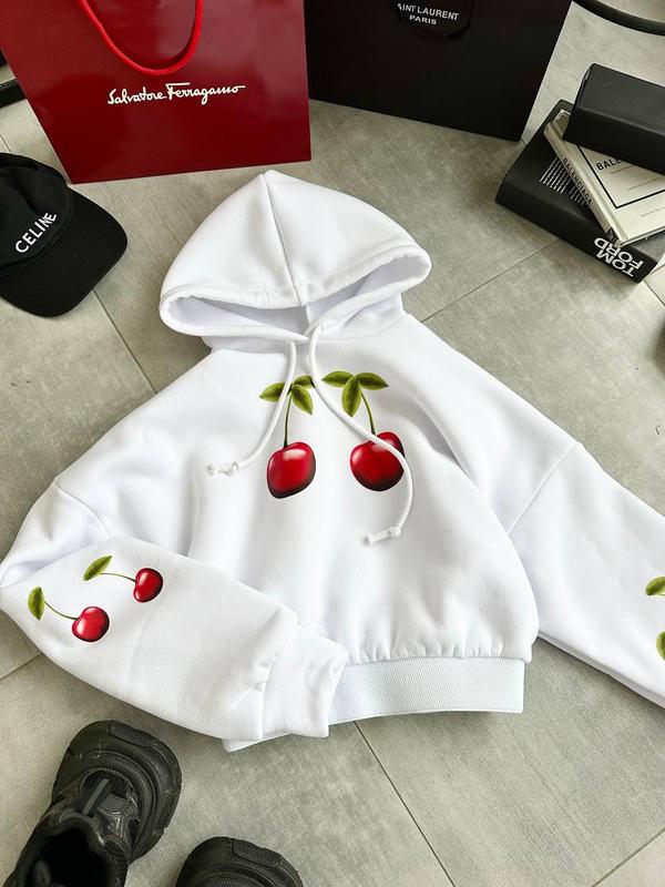 Фото реал 🍒Худи с вишнями🍒 Мод: 733 Ткань: Качественная трехнить на флисе Цвет: белый Размер:42-46 ✔️Пояс с декоративной резинкой ✔️Хороший накат 🔥Цена:700 грн ПОГ-58 см ПОТ-36 см Длина -50 см елен
