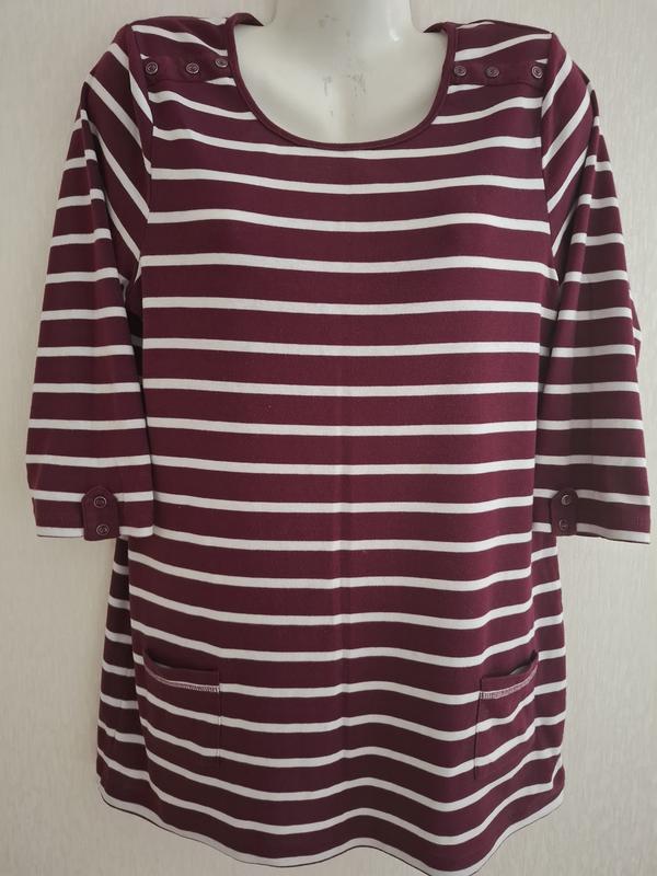 Кофтина удлиненная в полоску, тричетверты рукав с пуговицами, на рукаве и плечах, накладные накладные, удобная, приятная Размер:16(48/50) Плечи-39 Пог-52 Пот-49 Поб-56 Рукав-46 Длина-76 35%котон 65%полиэстер