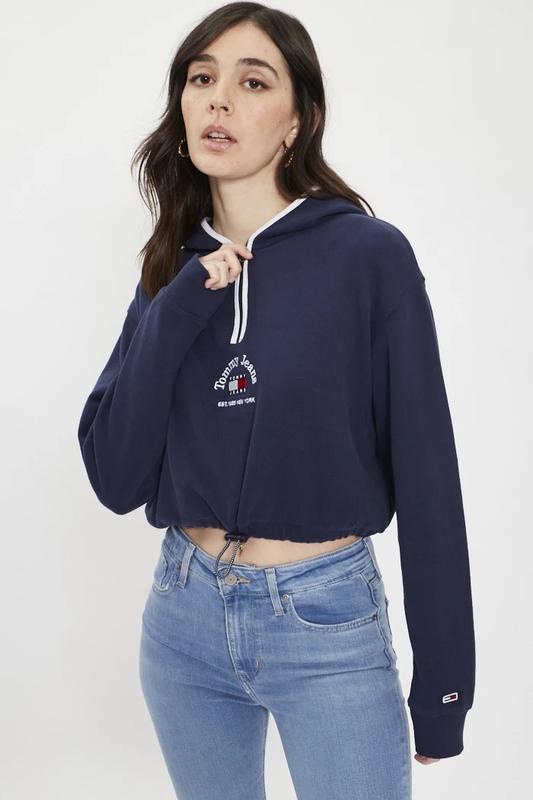 темно-синя жіноча толстовка з капюшоном від Tommy Hilfiger. Закохайтеся в його дизайн: короткий та еластичний на талії, який ідеально підходить для вуличного стилю. Склад 100% бавовна