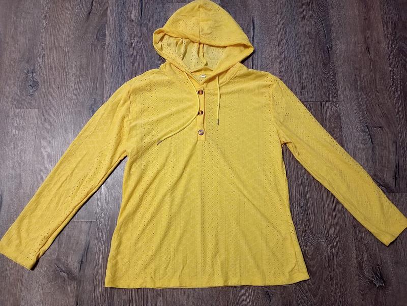 худі в прошву ,яскравого насиченого жовтого кольору ,на розмір 50-52(хл),замір ог 64-75 см,довжина 75 см