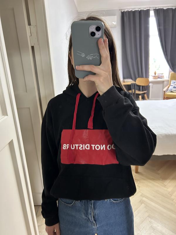 Чорне худі українського бренду Keepstyle з яскравим червоним акцентом та написом DO NOT DISTURB. Без утеплення — легке й універсальне, ідеальне для весни, осені або літніх вечорів. Має капюшон з червоними шнурками та зручну кишеню-кенгуру. Стан: дуже хороший, без дефектів Розмір: S-M (підійде також на XS) Параметри моделі: 80/64/90, зріст 163 см.