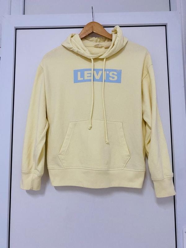 Худі Levi's. М'яка та зручна. Жовтий колір з синім брендингом. Еластичні манжети та низ. Капюшон з регульованим шнурком. Одна передня кишеня. Заміри: Плечі: 55 см Рукава: 55 см Обхват грудей: до 58 см Довжина: 60 см Еластичний низ: 47 см, розтягується до 56 см