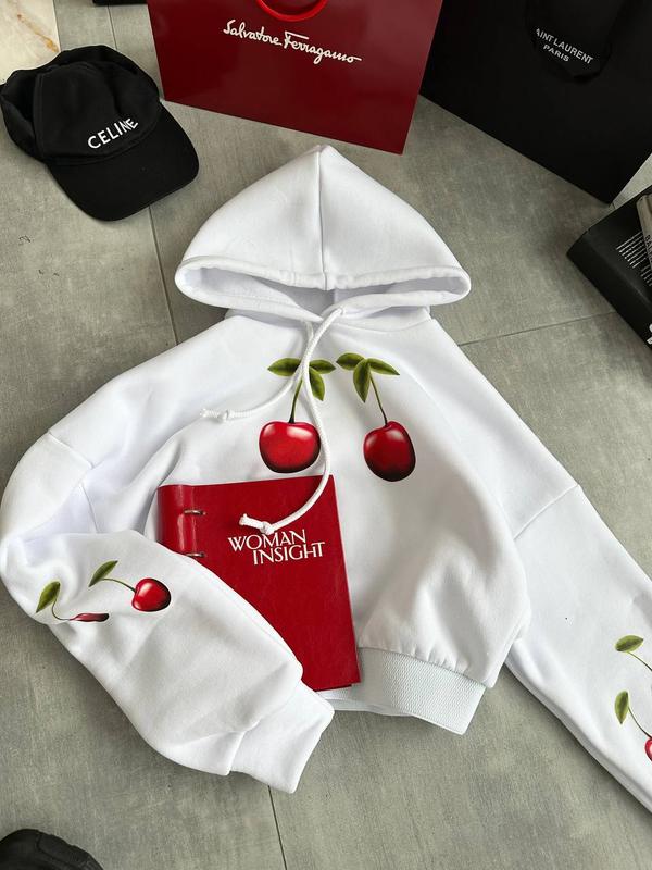 Реал 🍒Худі з вишеньками🍒 Мод: 733 Тканина: Якісна тринити на флісі Колір: білий Розмір:42-46 ✔️Пояс з декоративною гумкою ✔️Якісний накат ПОГ-58 см ПОТ-36 см Довжина -50 см