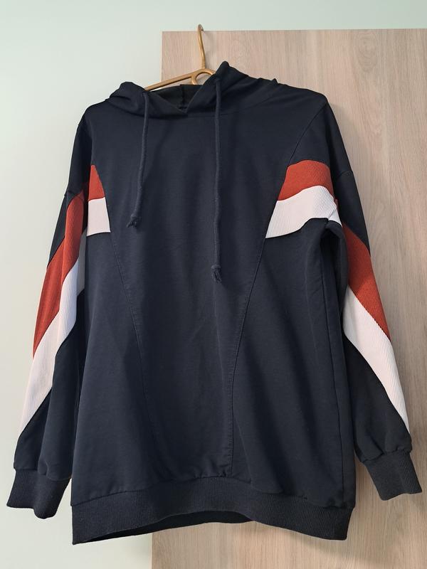 Стильное худи темно-синего цвета с бело-коричневым полосками на рукавах. Размер S. Идеально подойдет на осень. Не утеплетне.