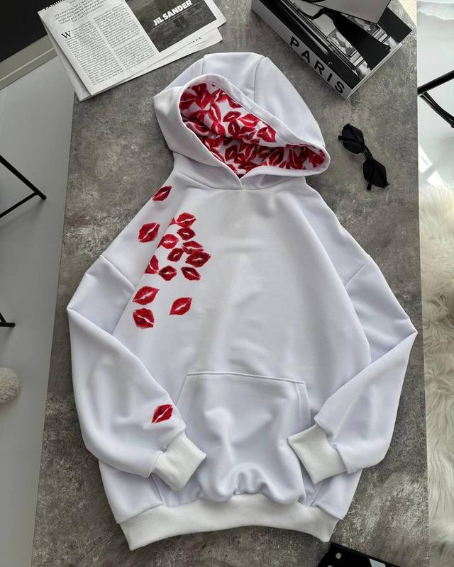 Код 235 Ткань: петля пенье + рибана Размер: 42-46 оверсайз Цвета: белый Стильный худи Unisex с поцелуями. В свободном фасоне. Из качественной ткани, которая не скатывается, не теряет цвет. Манжеты зерна. Рисунок - качественная накатка.