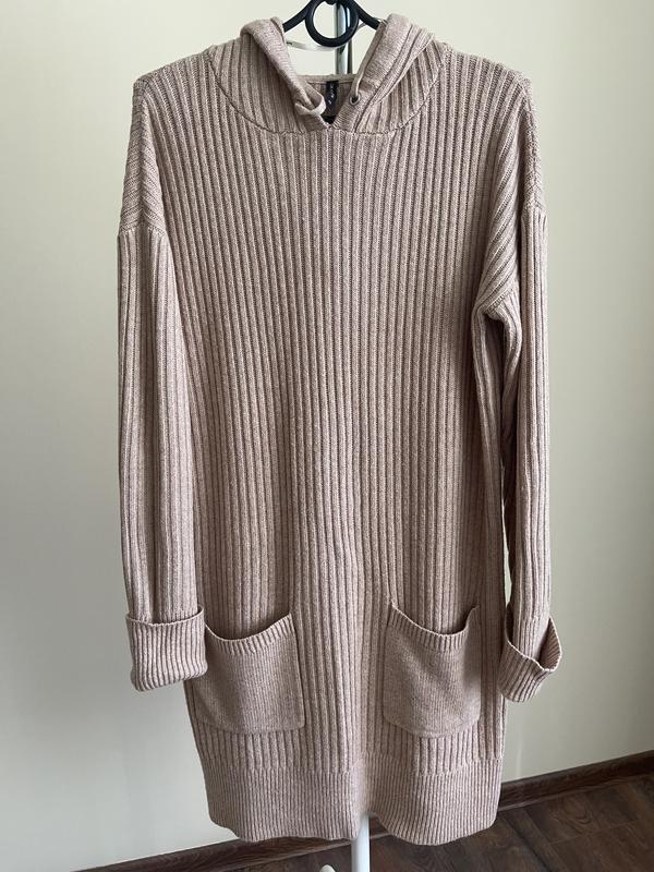 Нова без бірки вʼязана сукня- худі з капюшоном розмір L,колір бежевий меланж, накладні кишені, на рукавах відвороти. Ширина 59 см Довжина від плеча 85 см Плече+ рукав 17+52 см