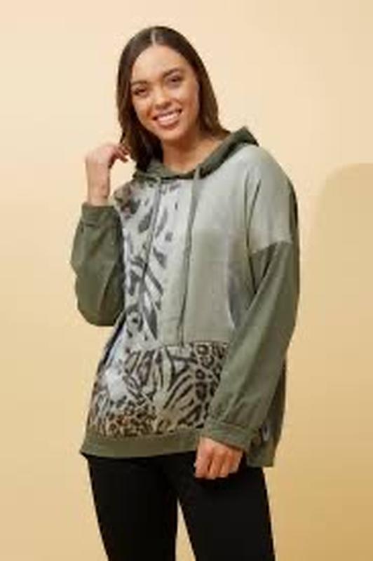 Худі з капюшоном і шнурками Isabel London. Модель оверсайз . Колір оливково-зелений. Спереду вставки з тканини (віскози) в принт ( імітація леопардовий принт). Розмір вказаний M. Пог 64-65см, довжина 67см, довжина рукава (лінія плеча опущена) від горловини 70см.. 50% бавовна, 50% віскоза. Нова річ.